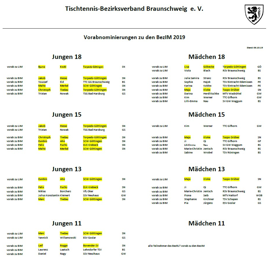 Übersichten der Freistellungen für die Altersklassen Nachwuchs: