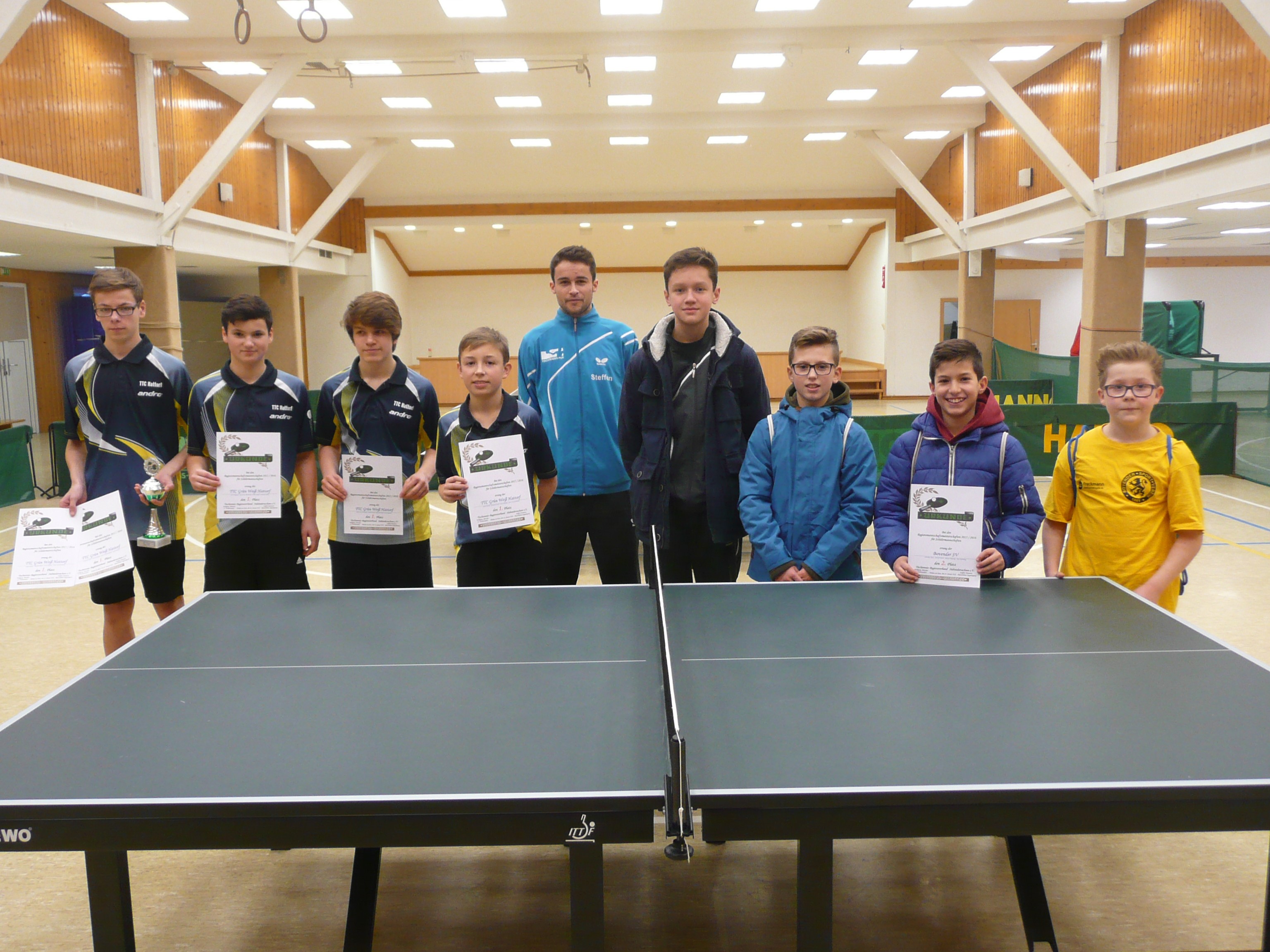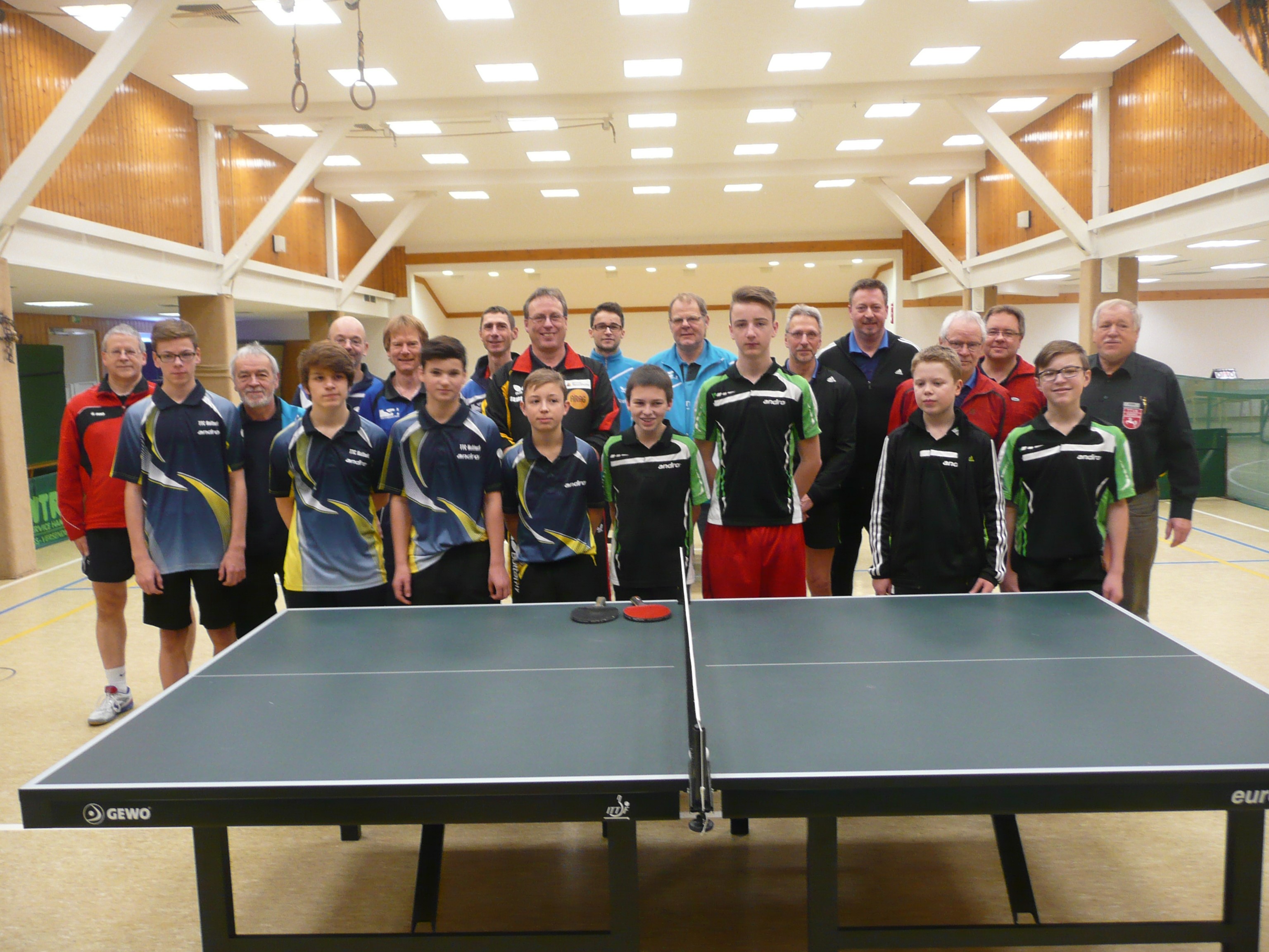 Die Schülermannschaftsmeisterschaften wurden im Bundessystem bis zum Siegpunkt ausgetragen im Modus „jeder-gegen-jeden“. Teilnehmer der Endrunde waren TTC Herzberg, TTC Hattorf und der Bovender SV. Nach zwei unglücklichen 4:6 Niederlagen musste sich der TTC Herzberg mit dem 3. Platz zufrieden geben. Nachdem der TTC Hattorf und Bovender SV beide gegen den TTC Herzberg gewonnen hatten, kam es im abschließenden Spiel zu einem echten Endspiel, das Hattorf mit 6:2 für sich entscheiden konnte. Damit konnte sich die Mannschaft vom TTC Hattorf in der Besetzung Brakel, Buhl, Depping und Bernhardt den Titel bei den Schüler sichern.![]()
