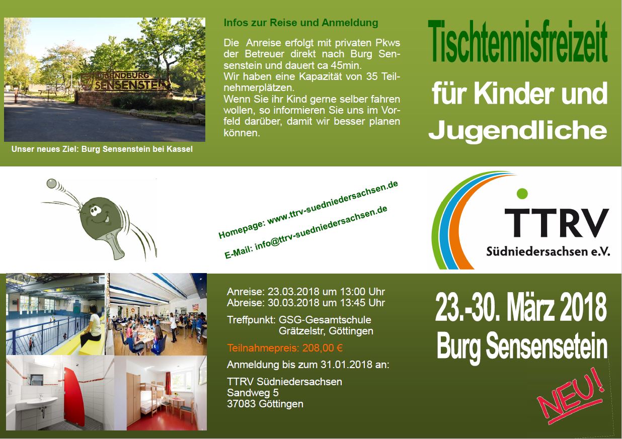 Das neue Jahr ist schon wieder einige Tage alt und wir blicken bereits der Osterzeit entgegen - die für uns schönste Zeit im Jahr. Denn auch in diesem Jahr haben wir wieder eine tolle Tischtennisfreizeit für Euch im Programm. Details über unser Angebot findet ihr im verlinkten Flyer. Es gibt noch freie Plätze für die gemeinsame Erkundung der "Burg Sensenstein". Lasst euch die Chance nicht entgehen!